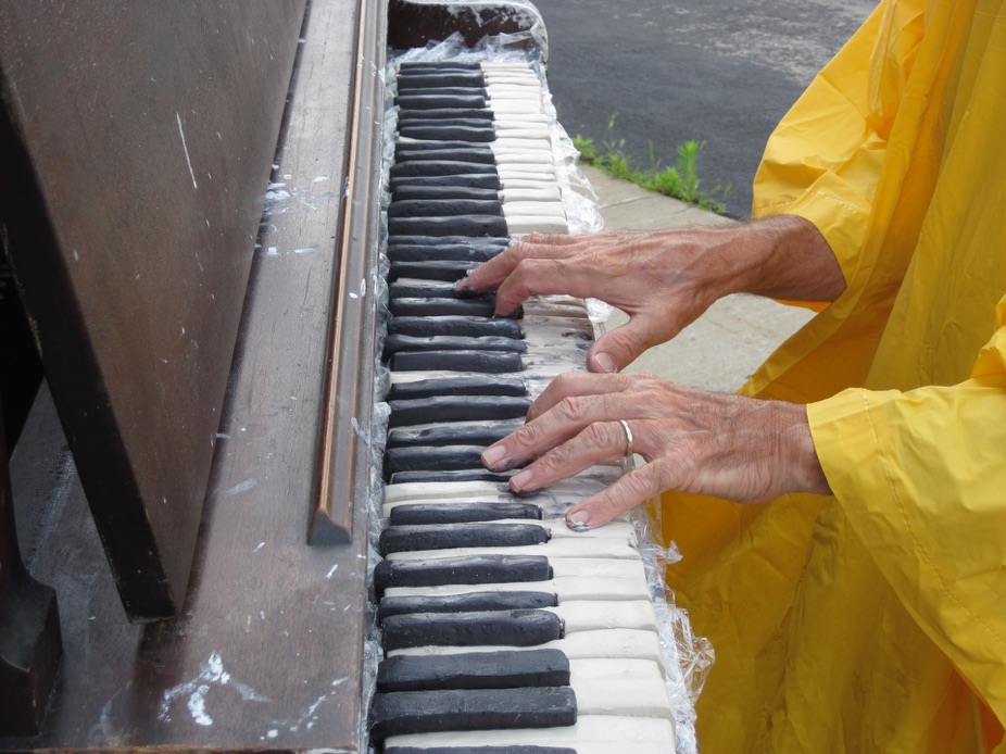 I engaged in the constant process of covering this piano’s keys with sets of soft hand-sculpted porcelain keys that I wheeled around the community, allowing bystanders to play until the keys were fused together (as if melted). I then peeled the clay keys off at the studio and replaced them with a new covering of clay keys so that I could repeat the process. This push of traditional materials and aesthetic values into an innovative zone defamiliarized both the activities of piano-playing and traditional hand-modeling. These porcelain “recordings” provided an awareness of the piano playing activity from the perspective of the keys that is simultaneously destructive to each key’s unique musical contribution: fused together in a cacophony, resisting each key’s nature to be struck and let go.