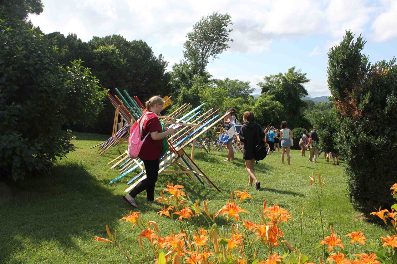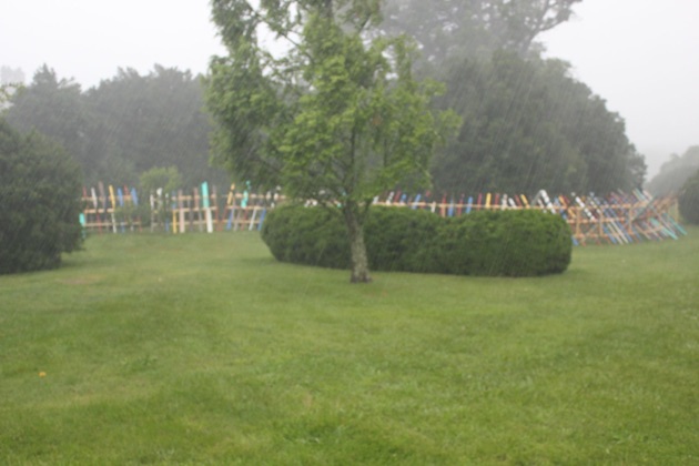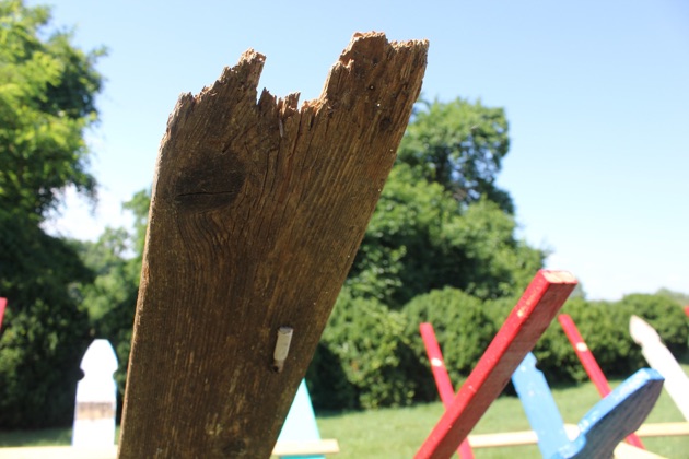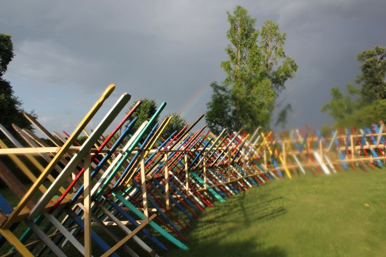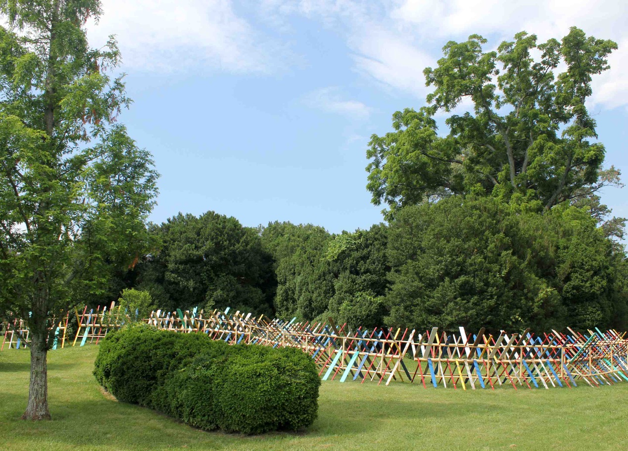 Discarded fence pickets are gathered, largely from foreclosed properties, and collectively assembled into chevaux de frise snaking throughout the grounds of the Virginia Center for the Creative Arts. The form, inspired by the medieval military design used to obstruct cavalry, was particularly functional as it could be fabricated with at-hand materials, was moveable, and could be reassembled without expensive metal nails. During the American Revolution and the Civil War, chevaux de frise were commonly thrown into trenches to prevent the free mobility of enemy soldiers. However, the fences’ sectional and moveable nature allowed them to be flipped vertically and used as ladders to climb out of the trenches. When submerged in water passages, held under by rocks, these pernicious configurations would puncture the hulls of oncoming ships. Each picket’s history has etched it into a unique contribution, and as one encircles the fence, it becomes a collective animation. While my upcoming projects will focus on dissolving boundaries, here I have created an unnecessary one. For the joy of it.