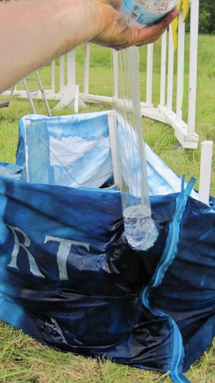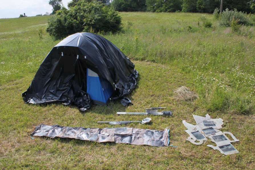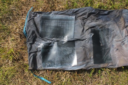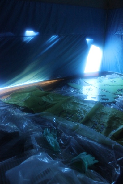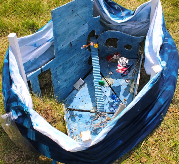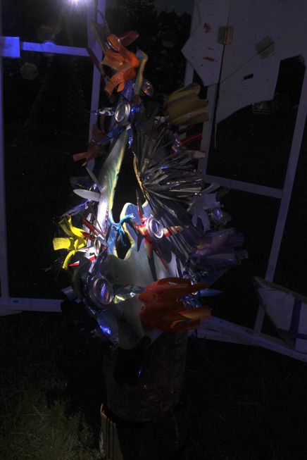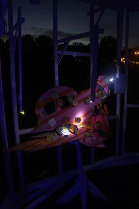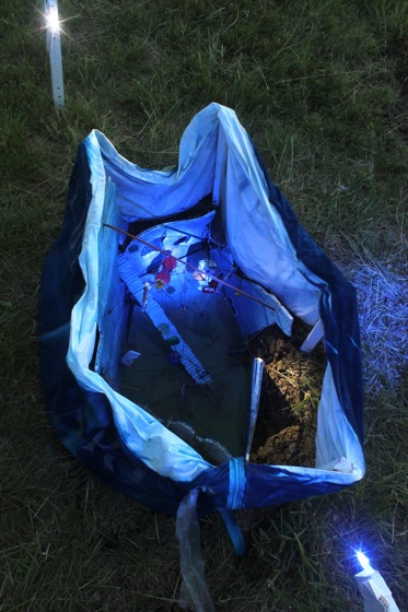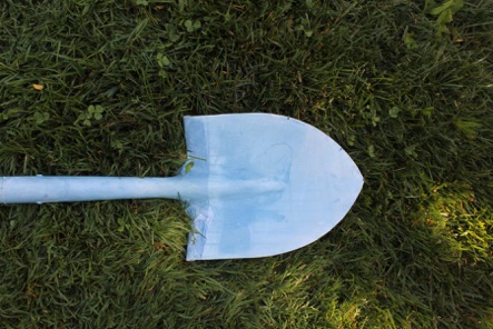My entire structure, including the shovels and tree-bladder used to represent the installation and nurturing of new art, have been exposed to the cyanotype photo process to subtly present images of Berlin’s Görlitzer Park that I captured in 2013. I visited Berlin to explore how allusive reinventions of the city’s architectural and cultural landscapes might be channeled into my own backyard as currents for discussion and change. In Berlin I learned that virtually the entire city was destroyed, and I was inspired by the conscious effort to leave the scars of its past intact. For example, the Pergamon Museum still stands riddled with pock marks of WWII artillery fire, the Kaiser Wilhelm Church belfry is still battered from past bombing raids, etc. In encountering rumors of Görlitzer Park - a World War II bombed train station turned public park with its crater-like landscape left unfilled - I found a paradox: a destroyed space turned joyful, as evidenced by community orchards, by committees asking the public to take action and transform their space, and by un-removed piles of marble rubble carved into giant talismans by local sculptors. Such reconstructions for new social purposes can be a stimulus for reflection and cultural memory.
