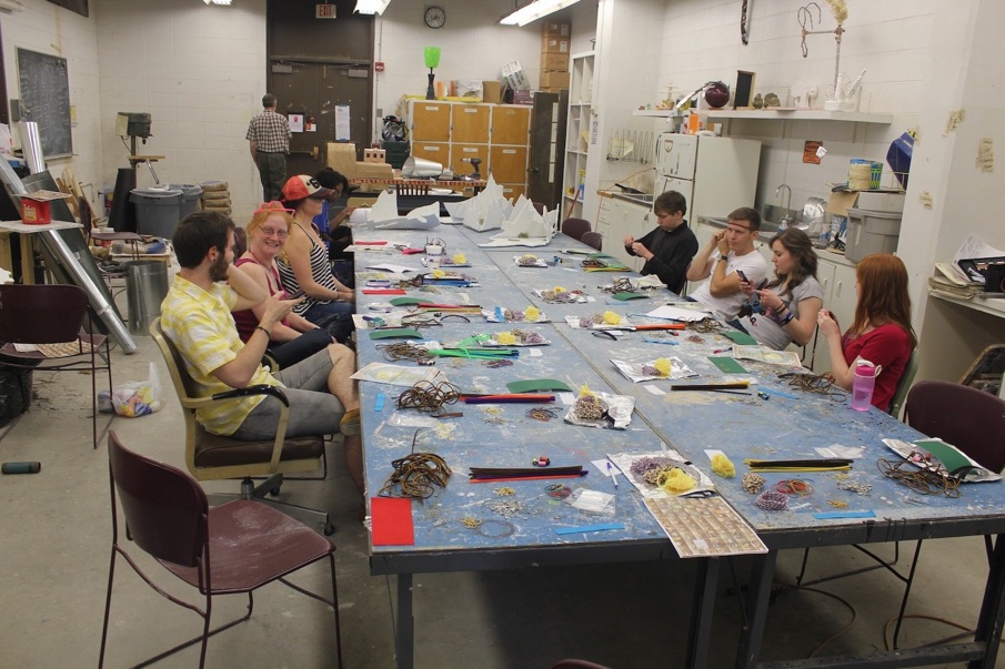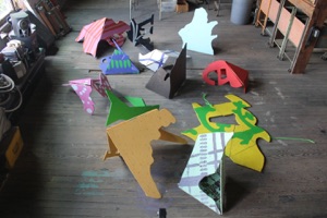 I then affixed their sculpture+kits onto a 2”x4” stud framework (the skeleton of a gallery) that spanned 8’ high and 30’ wide; thus participants were not just creating sculptures, they were also fabricating the gallery itself. The framework stood on large castor wheels.