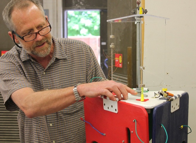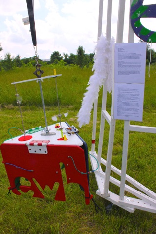 Statement: My intent was to create a play of connections in action, and do so in a way that demonstrates the connection of art and science. Some connections are static, some dynamic, some easily seen, some not so easy, some you may need to ponder, and some, I trust, you will conceive yourself. The medium consists of wood, wire, magnetism, gravitational force and items that bind objects together.