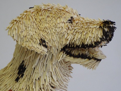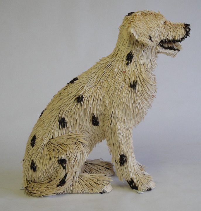 This playful juxtaposition of a fire station mascot made out of ignited and spent matchsticks was an exercise in discovering limits of patient self-control through treatment of cheap, expendable material with a high level of craft. The Dalmatian’s real-fur look required nearly 15,000 matchsticks, pre-burnt or with heads snapped-off to ensure safety. To create a grain, they were glued one-at-a-time starting with the feet. The black spots are the burnt ends. I remember my excitement at the discovery that “Strike-Anywhere Matches” could even be lit against a pair of Converse All-Stars.