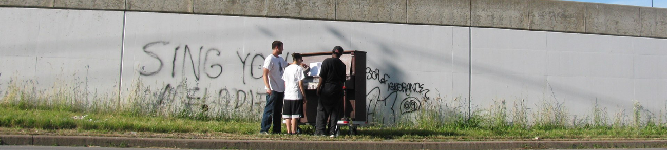 of ping pong balls to disrupt mundane activities, suspending sheets of blue plastic over a green field on a