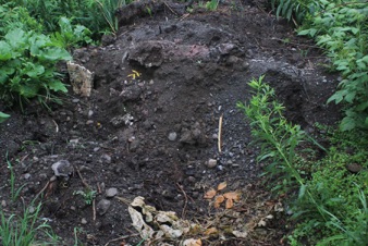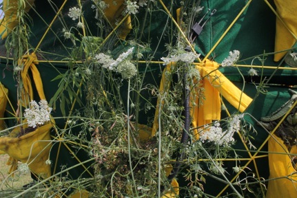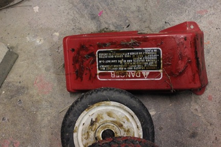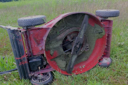 I also obtained both an old lawnmower and pine tar - a sticky sap-based material used by baseball players for better grip on the bat. I then coated the mower with the tar, and mowed the path surrounding the site. I disassembled the mower, now coated with sap, weed seeds, and plant fragments, and planted the lawnmower parts onto the sphere.
