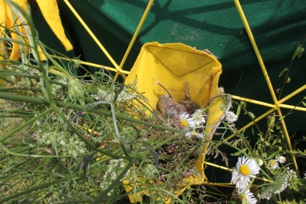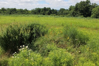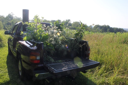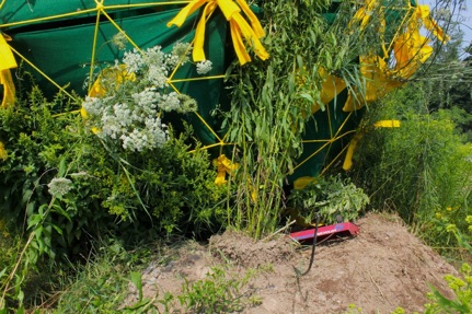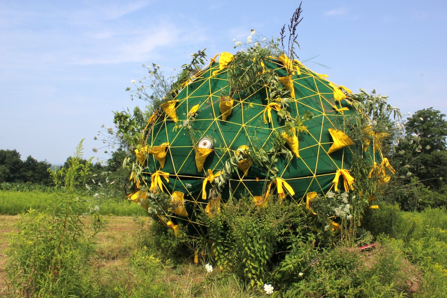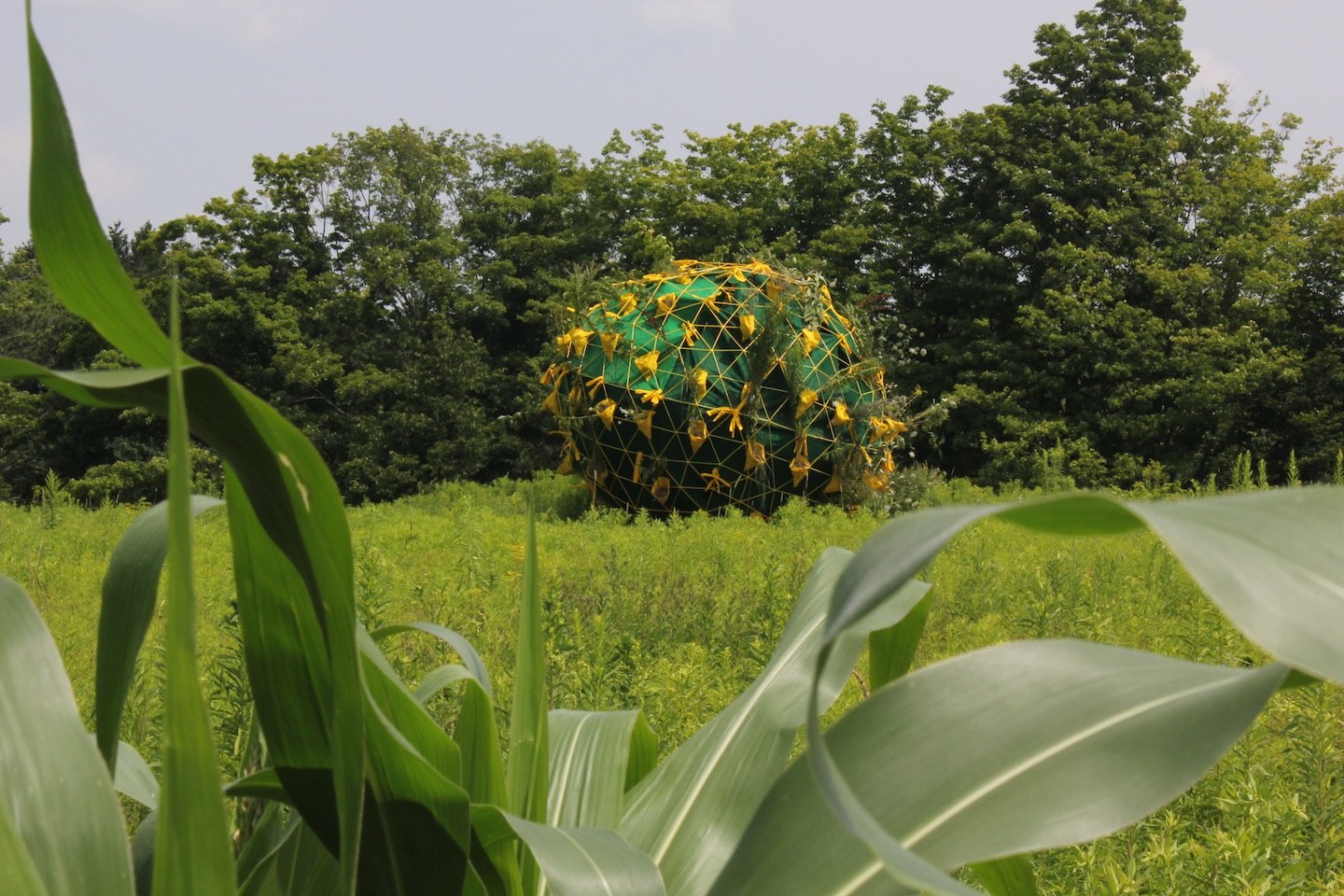 I was one of two sculptors invited to Stone Quarry Hill Art Park (near Cooperstown, NY, home of the Baseball Hall of Fame) for three weeks to do projects based on spherical forms. Not long after I arrived I was asked to help the groundskeeper re-weld a lawnmower crack, and I thought about how the gardeners, sculptors, and jurors curate the landscape equally. In a far, and sculpture-less, field of the park I found a pile of dirt and rubble being overtaken by weeds, just near corn rows that the groundskeeper’s brother usually harvests. I explored how well the corn was being mimicked by milkweed, and decided to elevate the weeds, and those of the nearby rubble pile, onto a sphere form - a privileged position that would allow a collection to be as dense as possible. The transplanted milkweed, no longer unwanted and having to mimic to survive. The sphere, installed onto the rubble pile and slightly askew, also supported porous pocketed pH neutral felt that roots love.