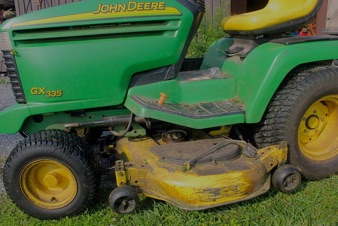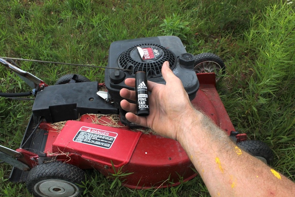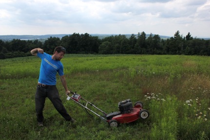 Mowing a path to the sculpture site using a lawnmower coated in baseball pine tar.